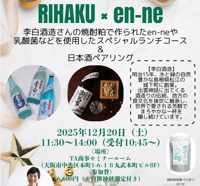 今年も残り3ヶ月になりました。トトノウェル倶楽部・年内最後のイベントのご案内です。 島根県松江市で明治15年に創業された『李白酒造』さんの日本酒とのペアリングランチイベント❤ ご存知の方も多いと思いますが「en-ne(エ […]