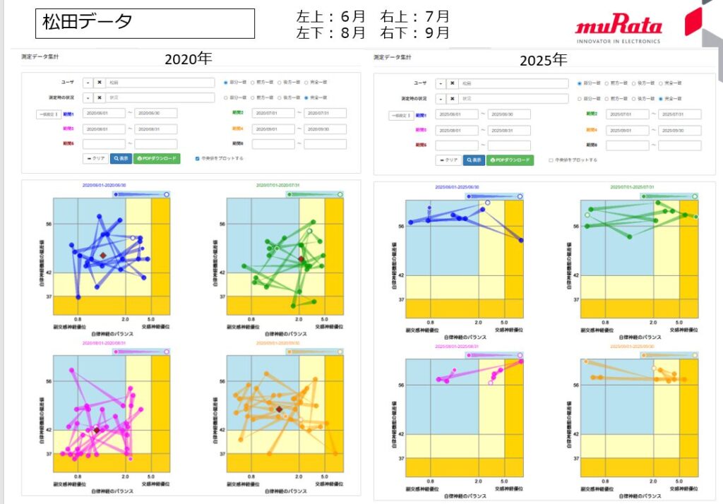 「トトノウェル俱楽部」のイベントでは、毎回、希望者の方に村田製作所 疲労ストレス計 MF100で自律神経の測定を行っています。また定期的に測定される方には、自律神経「見える化」シートをお作りして変化を確認いただいています。