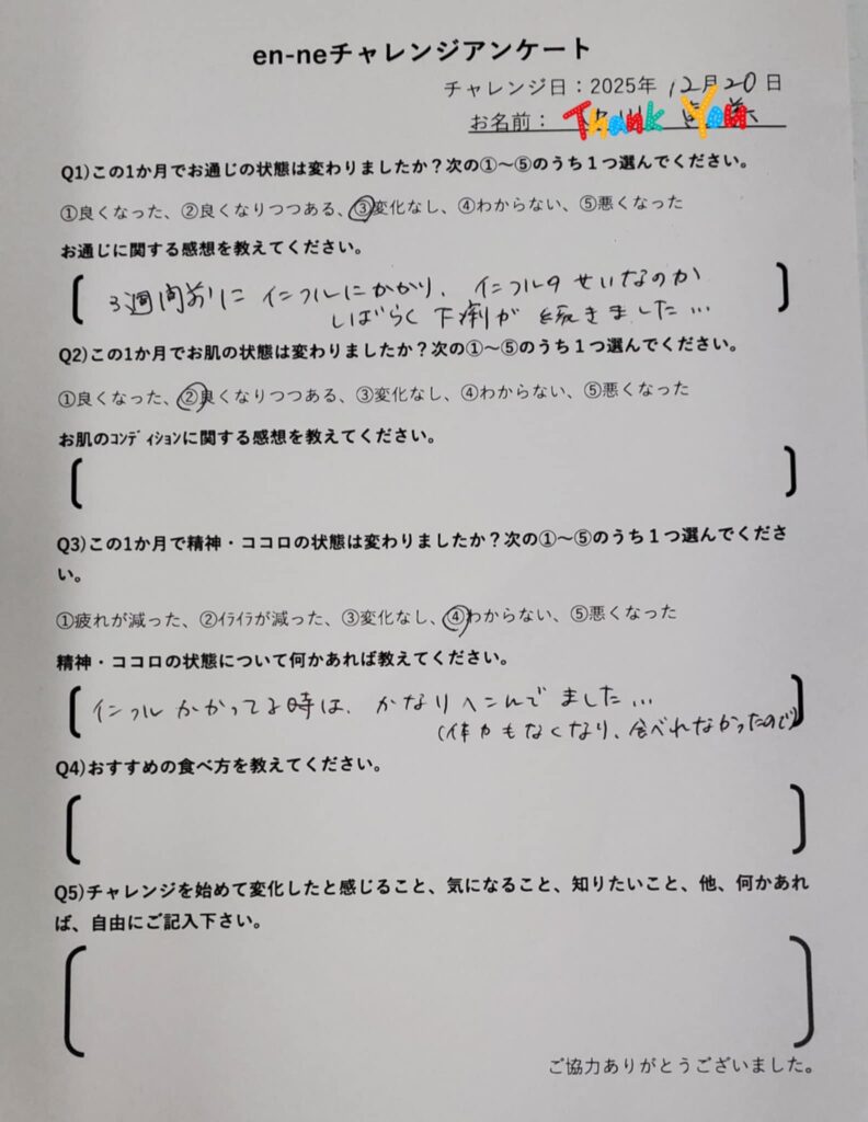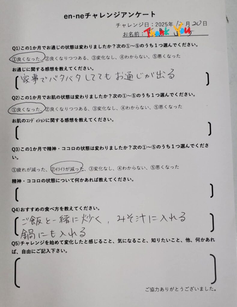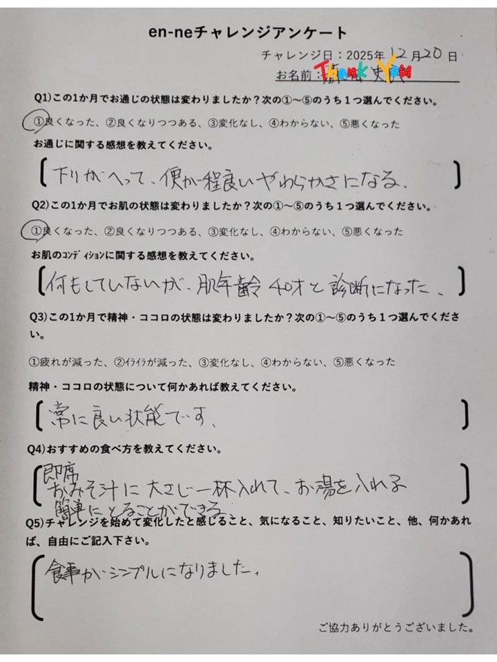 Iさん、私のSNSなどを見てくださり今年の7月から使用いただいています。腸内環境が整い始めて、お肌の状態も良くなってきているそうです♡