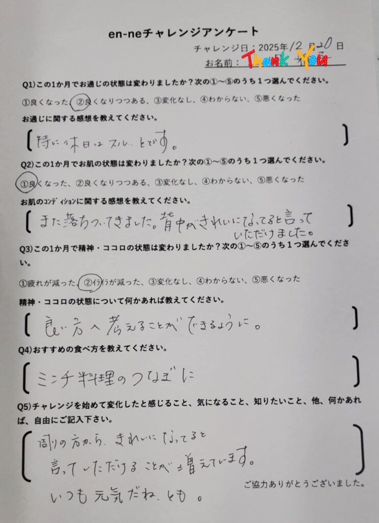 Mさんが初めに開始され、お肌や髪質・腸内環境が整い始めたことからEさん、Nさんも順に参加いただいています。