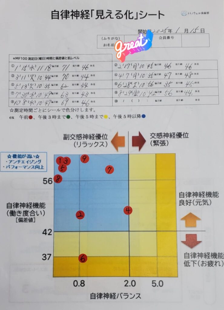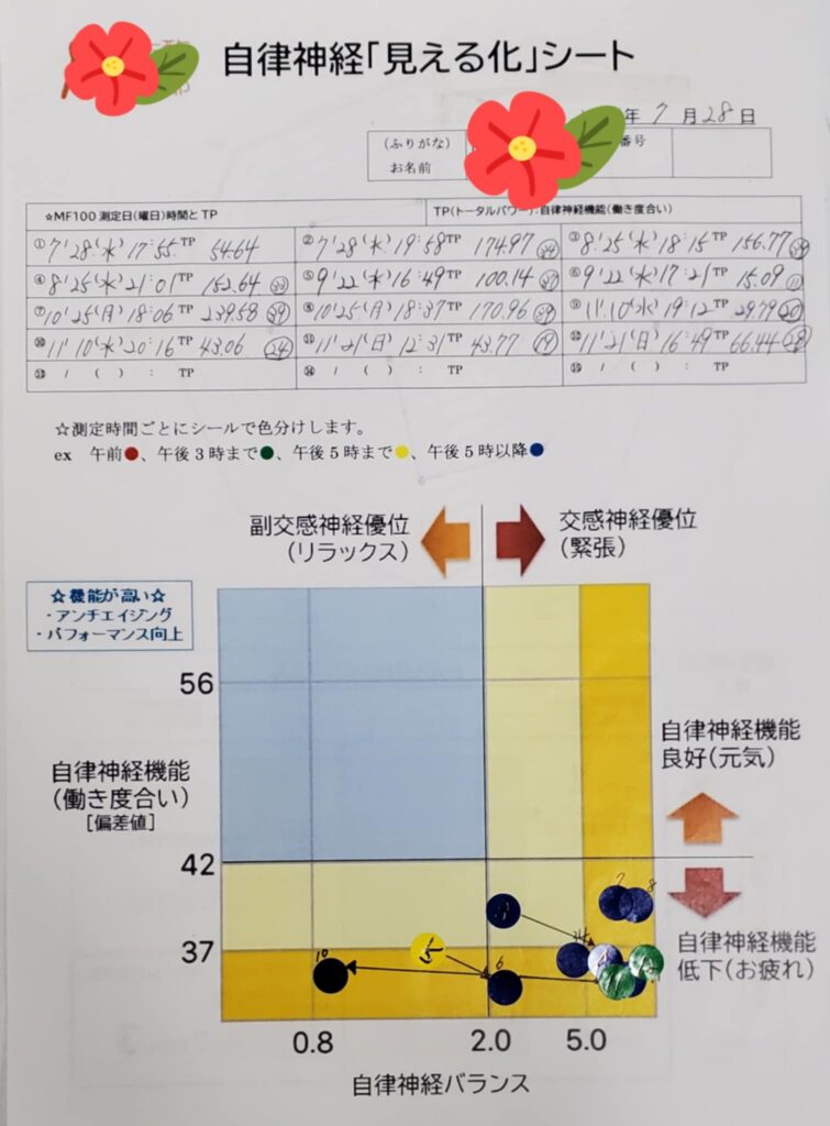 これらの状態は、普段なかなか見て確認することができませんが、MF100で自律神経の状態を可視化することで、免疫・内分泌の状態の参考にもお使いいただけます。
